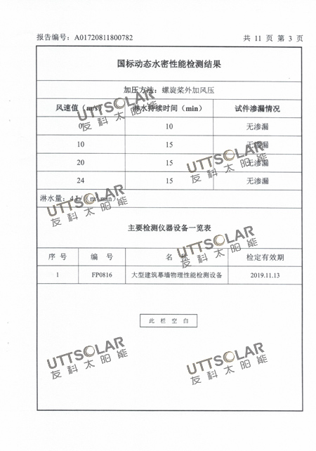 友科光伏瓦屋面 已經(jīng)通過(guò) 風(fēng)速10m/s、20m/s、24m/s 下的水密性能測(cè)試 證明了友科光伏瓦屋面可靠的防水性 ![]() 該試驗(yàn)由國(guó)內(nèi)建筑行業(yè)權(quán)威檢測(cè)機(jī)構(gòu): 江蘇省建筑工程質(zhì)量檢測(cè)中心 依據(jù)GB/T29907-2013 《建筑幕墻動(dòng)態(tài)風(fēng)壓作用 下水密性能檢測(cè)方法》標(biāo)準(zhǔn) 進(jìn)行檢測(cè)審核 結(jié)果為無(wú)滲漏!